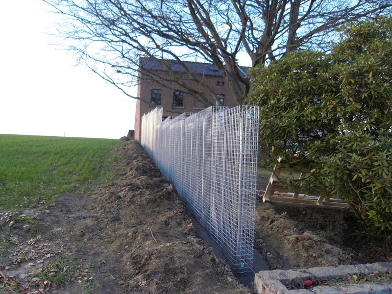La préparation du sol pour le placement de la nouvelle "clôture" à été la phase prépondérante de ce chantier. On devrait plutôt évoquer un véritable "mur", puisque c'est la technique des gabions qui a été sollicitée. Le rapport qualité-prix du gabion est en effet extrêmement intéressant.