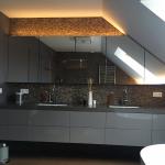 - Placement de l’électricité: éclairage au-dessus du lavabo, création d’un faux-plafond avec spots et extracteurs d’humidité intégrés ;