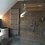 - Création de l’espace douche: construction d’une cloison en structure métal et Gyproc, pose d’un siphon encastré spécifique pour la douche à l’italienne, plafonnage des murs et réalisation d’une chape avec pentes intégrées ;